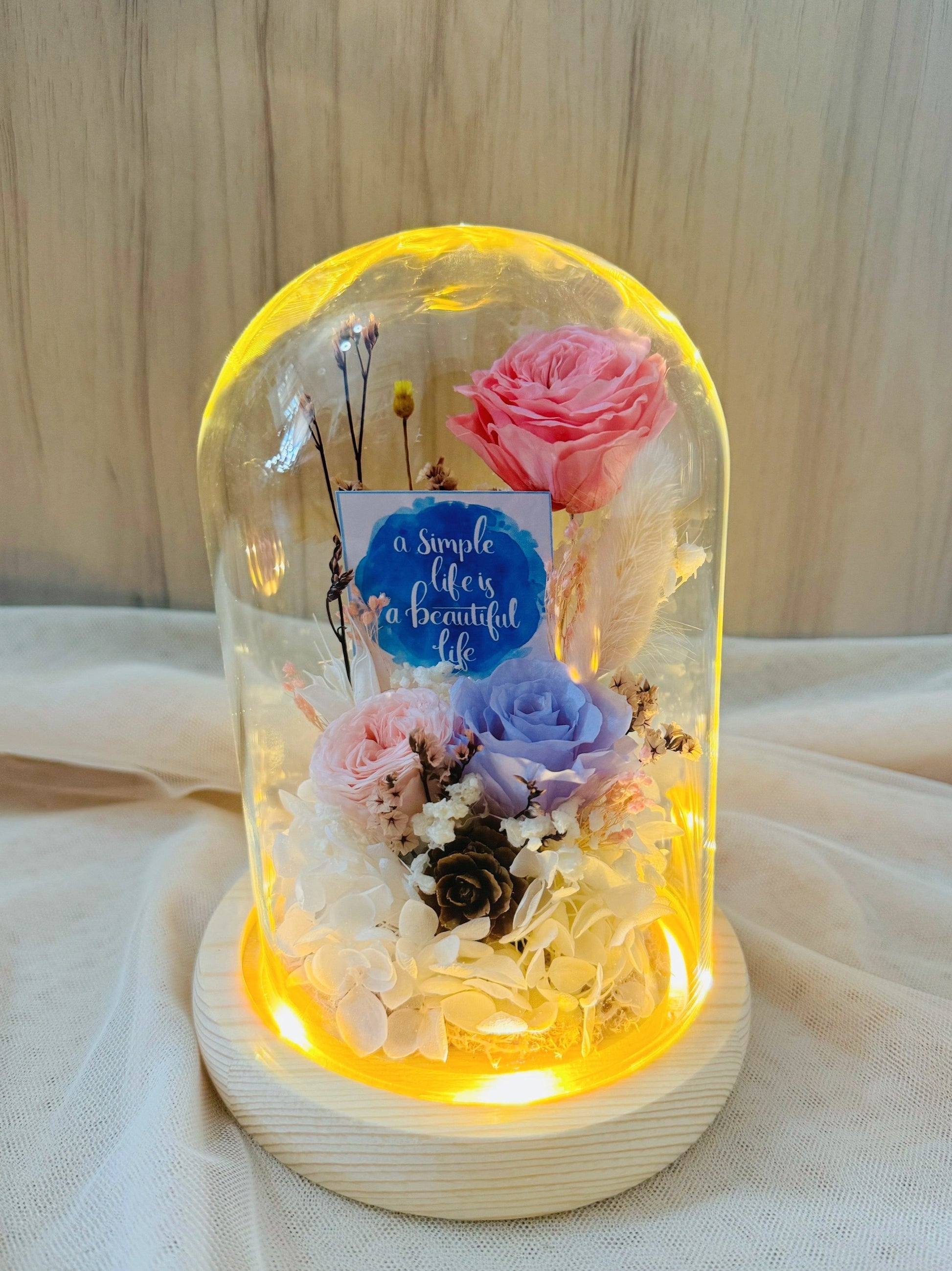 A Simple Life is a Beautiful Life Glass Dome with everlasting flowers beautifully arranged. Get this positive, encouraging quotes to cheer someone day today!